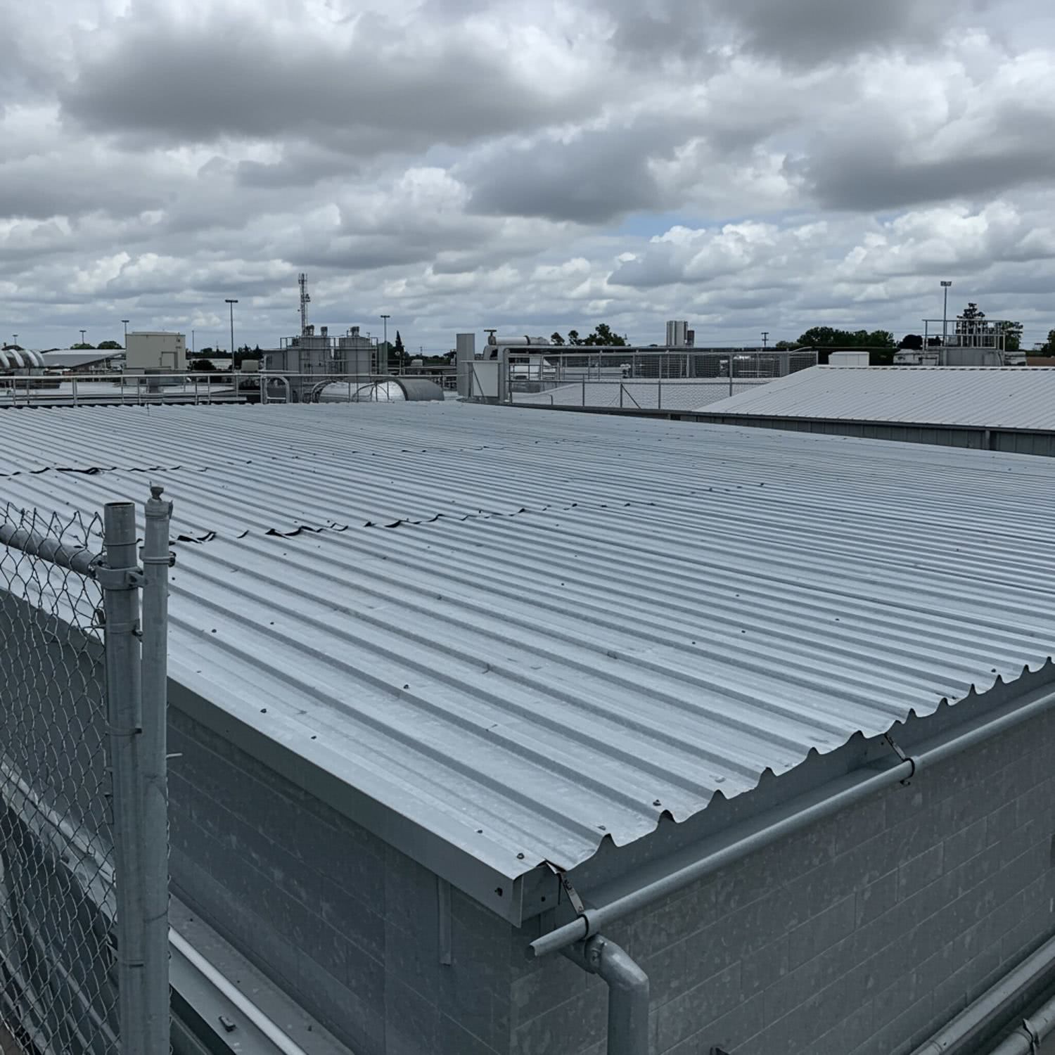 Modern professional industry photography: of a silver-gray, wavy galvanized steel roof on an industrial building, taken during the day with a cloudy sky in the background. The roof, showing slight weathering, is surrounded by a chain-link fence and includes visible gutters. The scene is set against a backdrop of other industrial structures, enhancing the industrial atmosphere without overwhelming the main focus. The natural daylight highlights the roof’s texture and metallic sheen, emphasizing its durability and resistance to atmospheric conditions. The composition focuses primarily on the roof, ensuring it remains the central element of the image. IMAGE STYLE: Use a vivid color palette