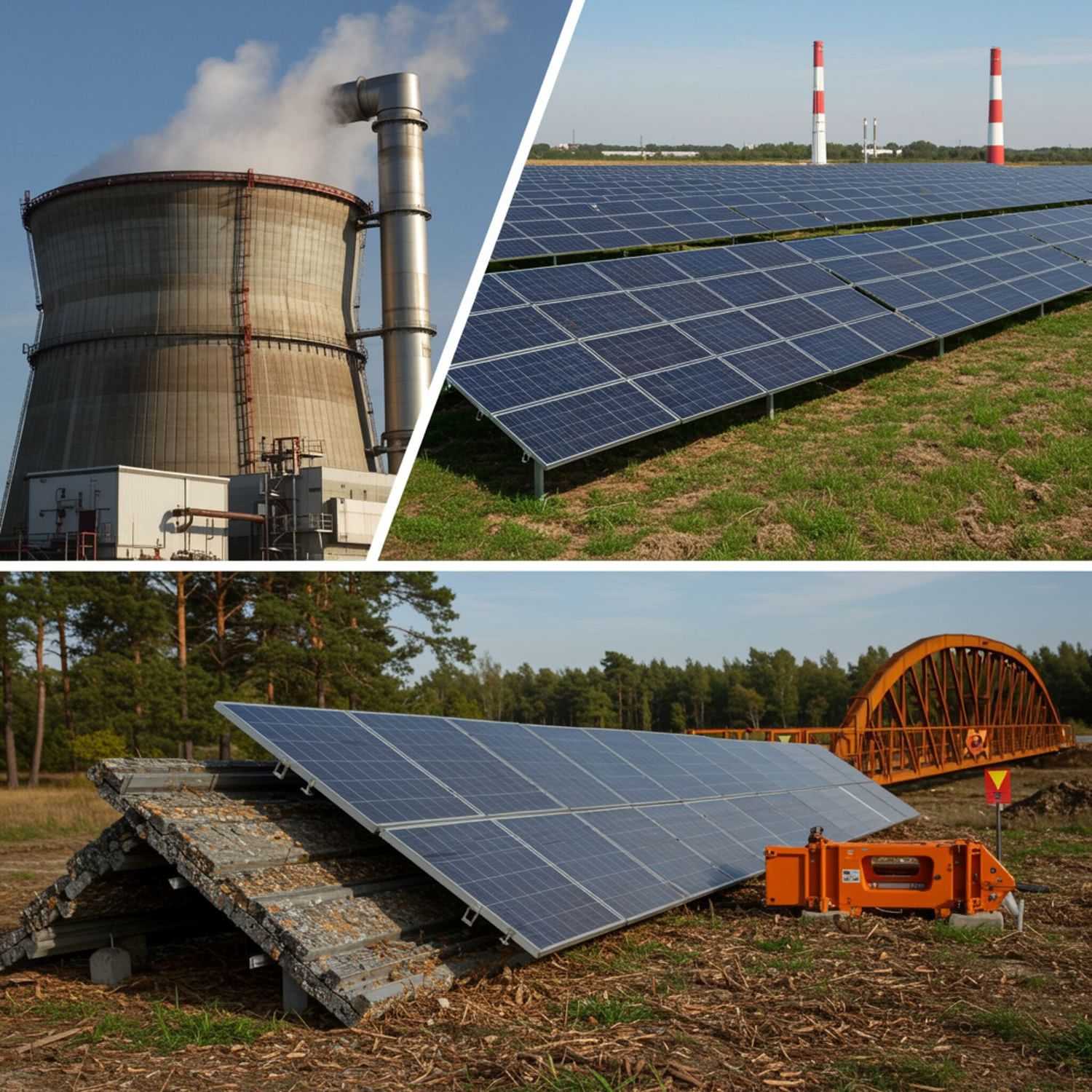 Modern professional industry photography: of three industrial scenes arranged horizontally, each highlighting a different material and setting. On the left, a nuclear reactor with stainless steel cladding in a high-temperature environment, possibly at a nuclear power plant. In the center, solar panels with aluminum frames set against a solar farm background under a clear sky. On the right, a temporary bridge made of Corten steel in an outdoor landscape, emphasizing durability. The overall composition is in a realistic style, focusing on the materials and their industrial applications without unnecessary details or distractions. The lighting is natural, enhancing the textures and colors of the materials, and the background is kept simple to maintain focus on the main subjects. IMAGE STYLE: Use a vivid color palette