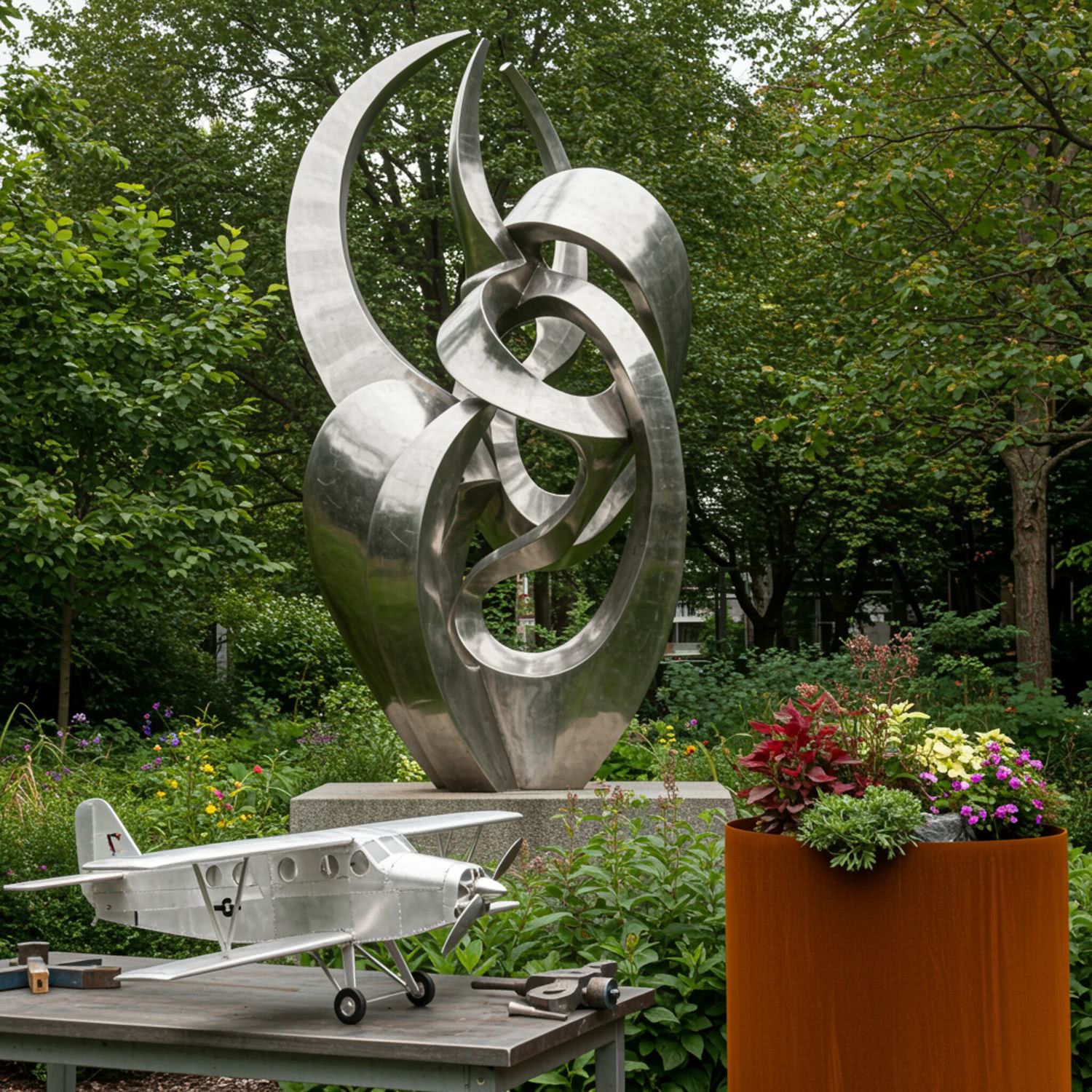 Modern professional industry photography: of a modern sculpture made from stainless steel in an urban park during the day. The sculpture, featuring abstract shapes and reflective surfaces, is the central focus of the image, set against a backdrop of trees and greenery. In the foreground, a model airplane made from aluminum sheeting sits on a workshop table, highlighting the detailed craftsmanship. To the right, a Corten steel pot filled with vibrant plants is placed in a lush garden area. The scene is lit by natural daylight, enhancing the textures and colors of the metal and surrounding foliage. The composition avoids any distracting elements, focusing solely on the harmonious interplay between the metal creations and their natural environment. IMAGE STYLE: Use a vivid color palette