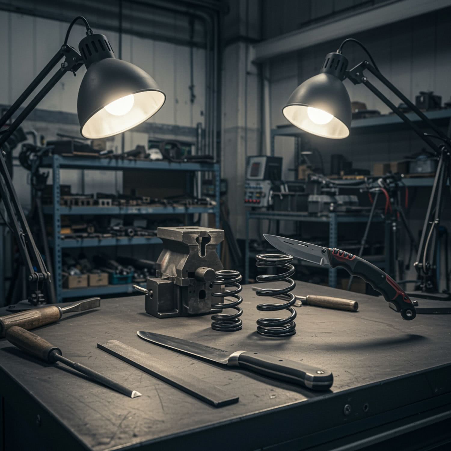 Modern professional industry photography: of an industrial workshop focusing on a central workbench with a kitchen knife and a mechanical spring made from steel sheets. To the left, various tools such as a chisel and file made from tool steel are visible, while on the right, an automotive suspension and a survival knife crafted from knife and spring steel are displayed. The scene is lit with overhead industrial lamps, casting shadows and highlights on the metallic surfaces, emphasizing the realistic texture of the metal. The background features shelves with additional tools and parts, maintaining a focused yet detailed workshop environment without unnecessary distractions. The overall composition highlights the metallic elements and tools in a clear, well-lit setting. IMAGE STYLE: Use a vivid color palette