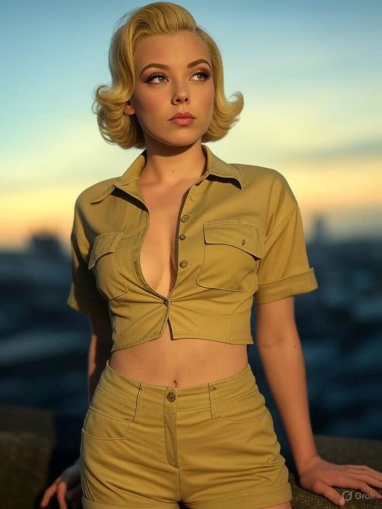 Flirt nabiera komediowego wymiaru w gestach – od przesadnego mrużenia oczu po teatralne poprawianie włosów, podczas gdy khaki koszula czasem „przypadkowo” odsłania więcej, wywołując salwy śmiechu. Inspiracja ikonami jak Marilyn Monroe dodaje im lekki, żartobliwy pazur, a różnorodność odcieni skóry i fryzur tworzy barwną paletę humorystycznych zalotów.