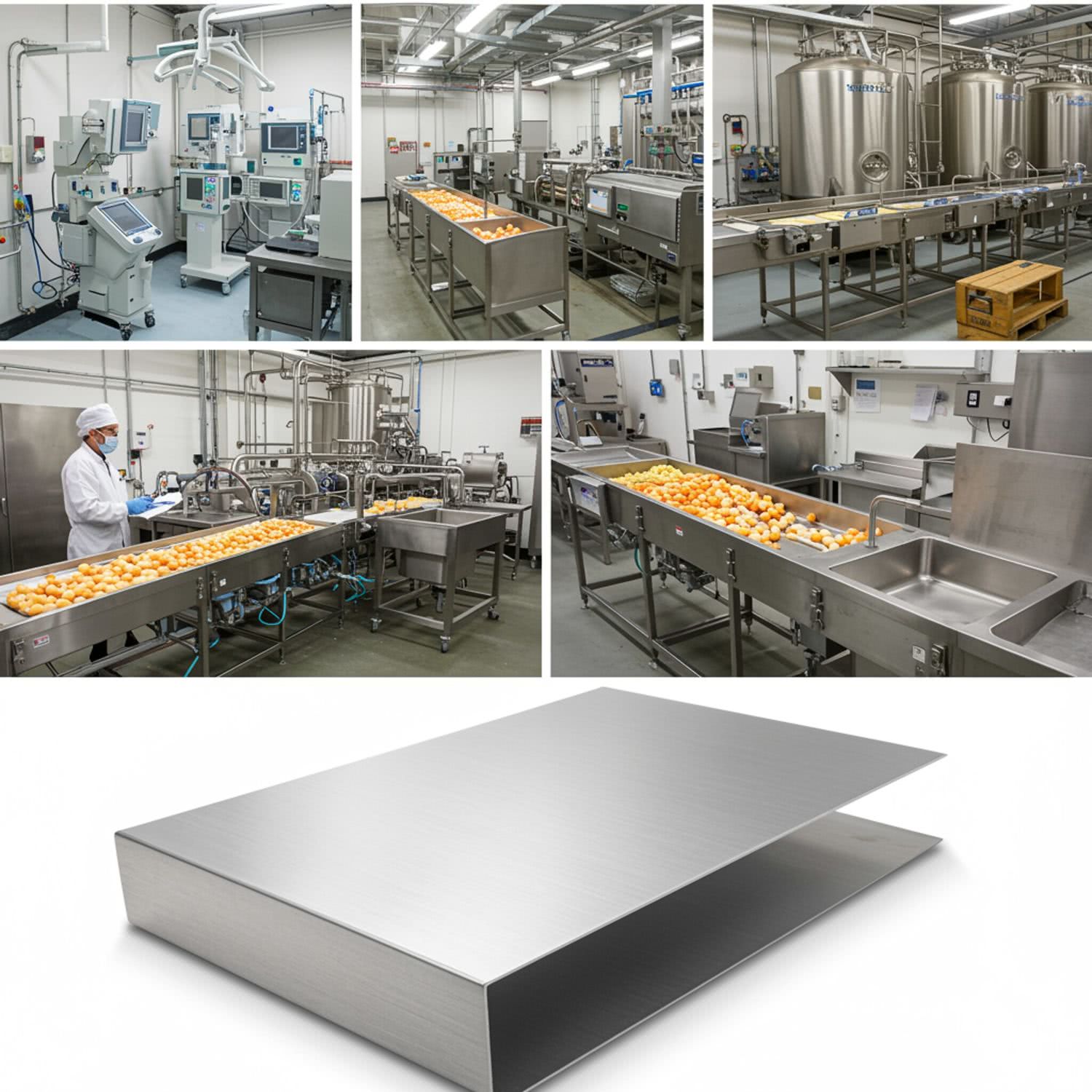 Modern professional industry photography: of a stainless steel sheet displayed prominently in the foreground, showcasing its shiny and durable surface. In the background, various industrial and everyday settings are visible, including a medical environment with medical equipment, a food processing line, a kitchen sink, and a chemical storage tank, all made of stainless steel. The lighting highlights the metallic sheen of the steel, emphasizing its reflective and robust qualities. The scene is set in a clean, well-lit environment, focusing on the versatility and durability of the material without any distracting elements or text. The composition ensures that the stainless steel sheet remains the central focus, surrounded by complementary but not overwhelming details. IMAGE STYLE: Use a vivid color palette