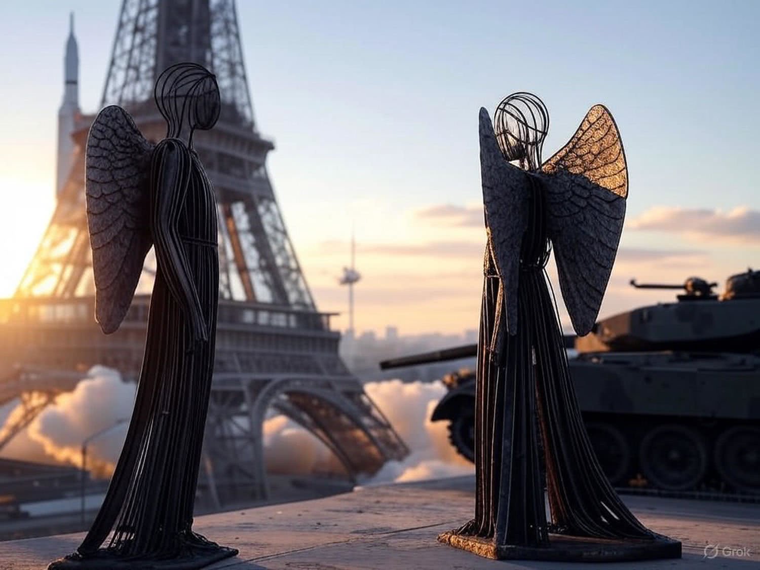 Modern professional industry photography: of the Eiffel Tower at sunset, with a Corten steel angel sculpture in the foreground. The angel is depicted in a contemplative pose, facing slightly towards the Eiffel Tower. In the midground, a space rocket is launching, its flames and smoke adding a dynamic element to the scene. A military tank is positioned to the right, slightly blurred to maintain focus on the main subjects. The background features a clear sky with the setting sun casting warm light on the steel structures, highlighting their textures and details. The overall composition emphasizes the evolution of steel engineering without unnecessary distractions, set in a realistic and detailed environment. IMAGE STYLE: Use a vivid color palette