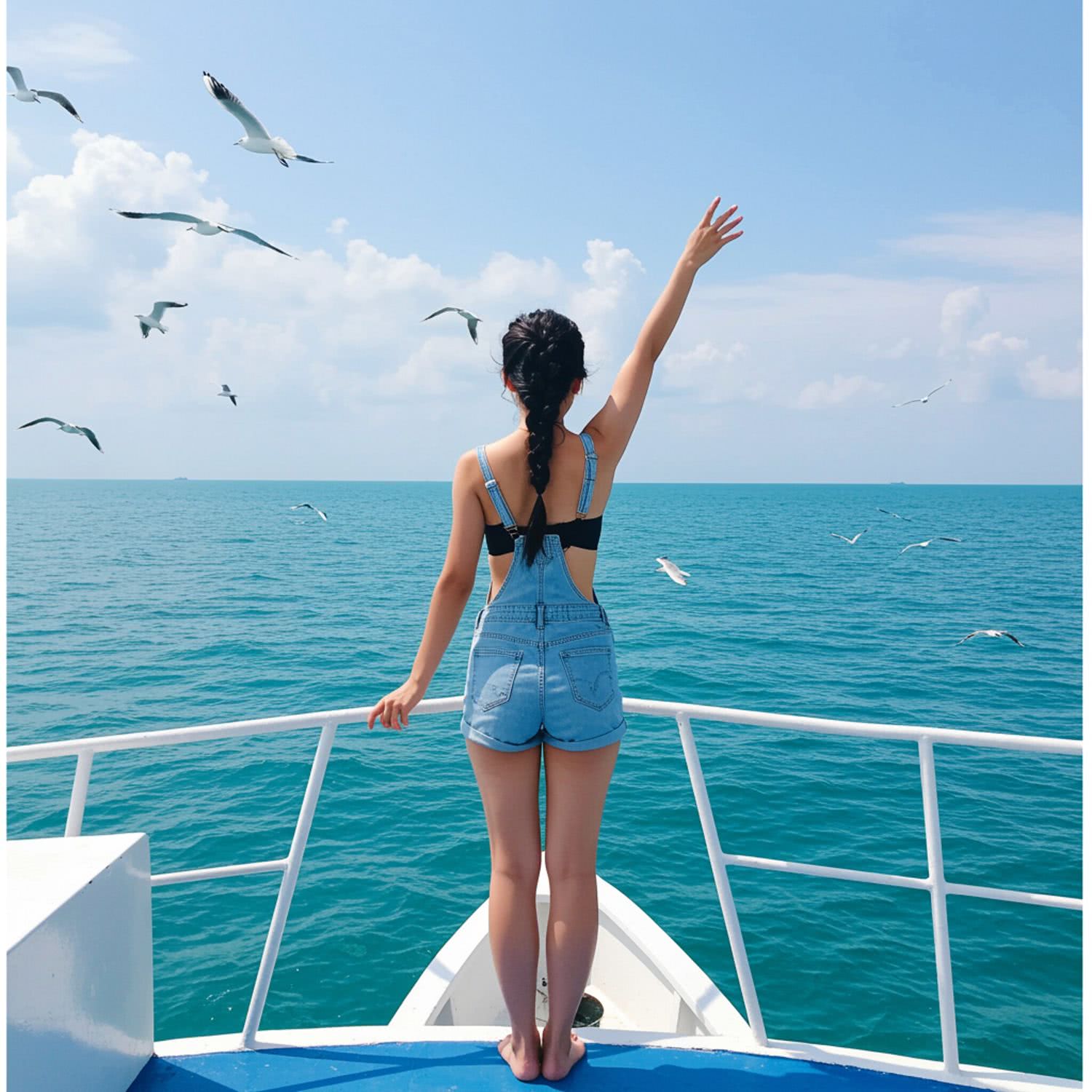 Safe for all audiences, without explicit nudity. Professional lifestyle photography style with predominant vivid colors: of a slender woman with black hair in a loose French braid, standing on the deck of a tourist boat. She has a subtle tan and is wearing light denim short overalls and a black push-up bra with a metal clasp. She faces away from the calm, blue sea, with her legs slightly apart and knees bent, one hand raised in a gesture of freedom and the other resting on her hip. The background features a bright, sunny day with flying seagulls and a clear sky with scattered clouds, creating a joyful and summery atmosphere. The scene is devoid of any distracting elements, focusing solely on the woman and the serene sea around her. BACKGROUND STYLE: Add white papercut thin canvas.