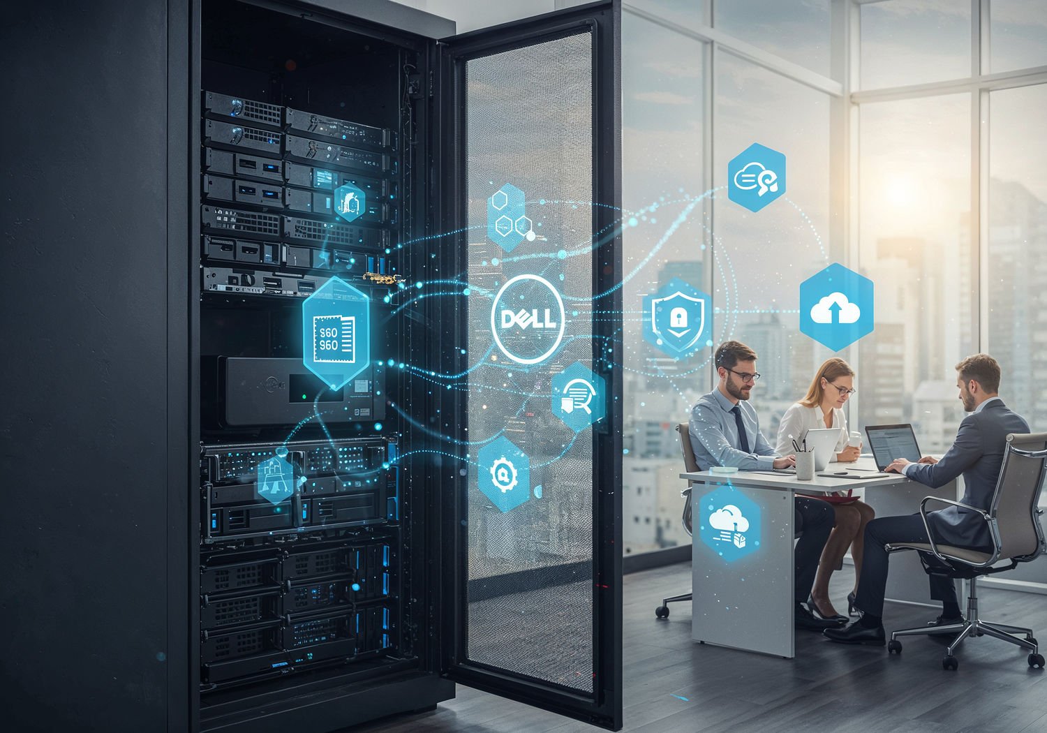 Image: Impressionist painting, vibrant colors, capturing the moment, visible bold brush strokes, broken color technique, vivid colors, soft focus; A compact Dell PowerEdge R260 server mounted in a 1U rack inside a small office server cabinet, surrounded by glowing data streams and icons for Intel Xeon processors, SSD drives, RAID arrays, security shields, cloud integration, and iDRAC9 management interface, with a diverse small business team collaborating on laptops in a nearby workspace. ;Image without icons or texts.