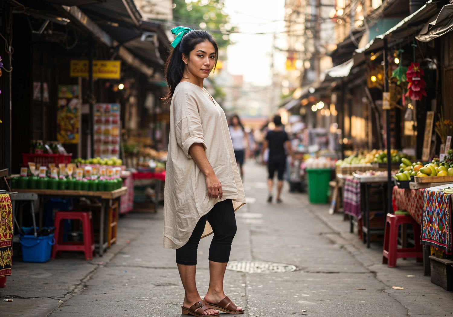 Zacznijmy od bazy, bo to ona nadaje całemu lookowi ten wiosenny, beztroski vibe. Wyobraźcie sobie luźną tunikę z lekkiego, zwiewnego materiału – może bawełny z domieszką lnu, w odcieniach bieli, beżu lub delikatnego błękitu, które pięknie kontrastują z ciepłym, oliwkowym tonem skóry naszej Tajlandki. Tunika powinna być oversize’owa, ale nie przytłaczająca: luźno opada na biodra, eksponując smukłą talię i sportową sylwetkę. A do tego legginsy capri, kończące się tuż poniżej kolan – czarne lub w stonowanym grafitowym kolorze, które podkreślają długość nóg i filigranową budowę ciała.