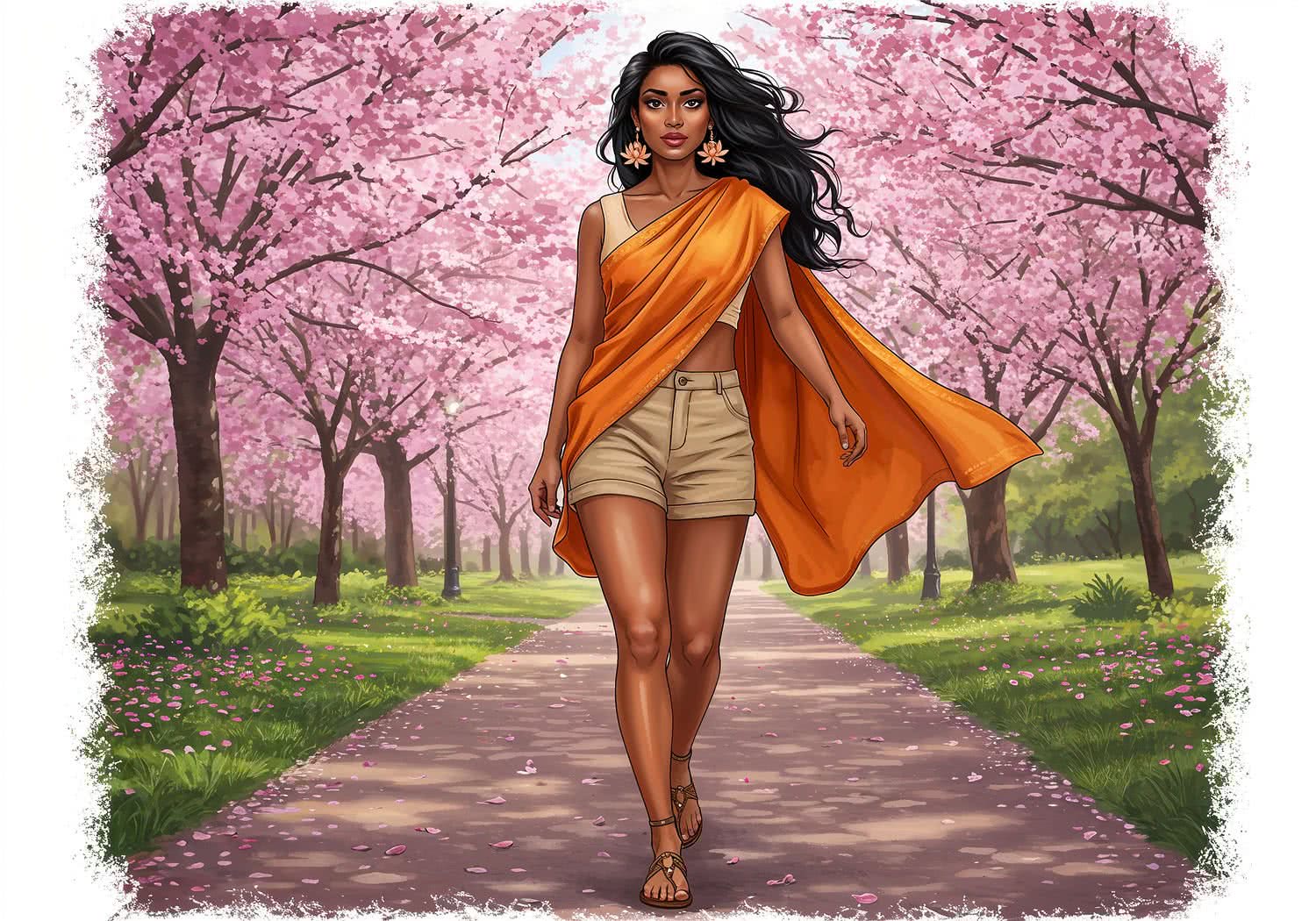 Safe for all audiences, without explicit nudity. Professional lifestyle photography style with predominant vivid colors: A professional illustration of a confident young woman with warm brown skin, long flowing black hair with bleached blonde tips waving in the spring breeze, and dark expressive eyes accentuated by subtle black kohl eyeliner. She has a slender figure, wearing a lightweight sari-inspired top in saffron orange silk that drapes asymmetrically over her body with a side slit revealing a hint of skin, paired with fitted khaki short shorts that highlight her toned legs. On her feet are simple boho-style flat sandals with woven straps and delicate bead accents. She walks gracefully along a blooming spring park path lined with cherry blossoms and green foliage, a soft wind gently lifting the fabric of her top, evoking a sense of effortless fusion between Indian elegance and casual street style. Her makeup is minimal: pink matte lips and a light glow on her cheeks. Include subtle accessories like dangling lotus-motif earrings. The overall mood is vibrant, feminine, and empowering, in a realistic yet stylized digital art style. BACKGROUND STYLE: Add white papercut thin canvas.