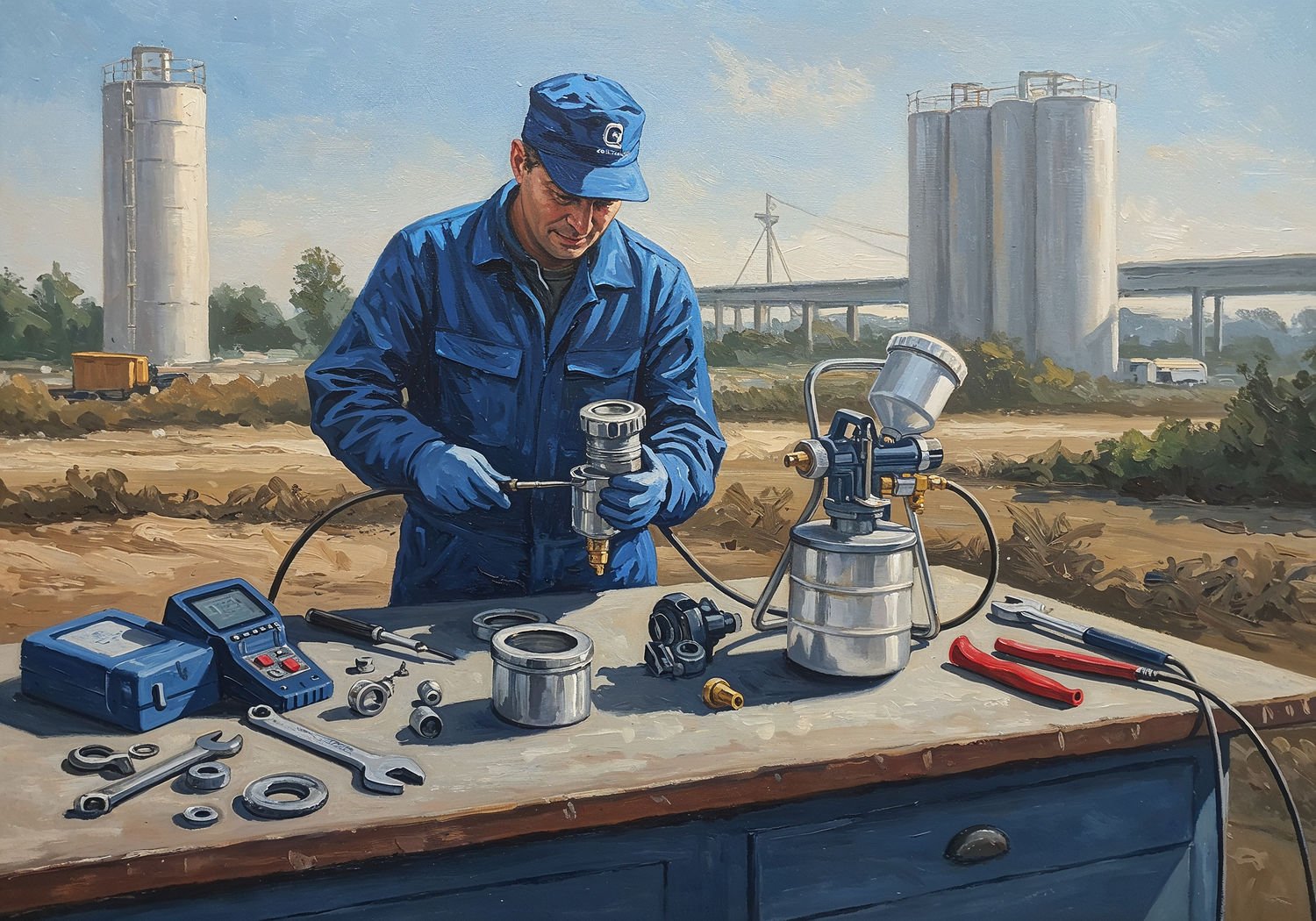 Image: Impressionist painting, vibrant colors, capturing the moment, visible bold brush strokes, broken color technique, vivid colors, soft focus; A professional technician in a workshop in Małopolska, Poland, meticulously repairing an airless painting aggregate machine on a workbench, with tools like wrenches and diagnostic scanners nearby, original parts from brands like Graco and Wagner scattered around, a disassembled pump and nozzle being inspected, in the background a construction site with a bridge or industrial silo being spray-painted, emphasizing precision and reliability. ;Image without icons or texts.